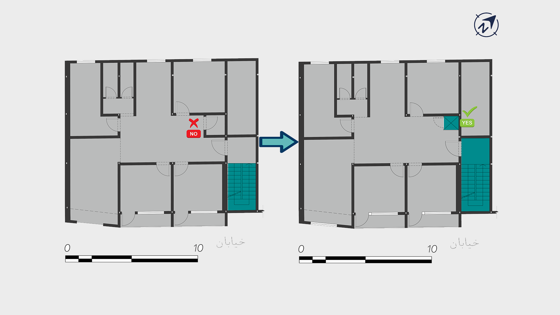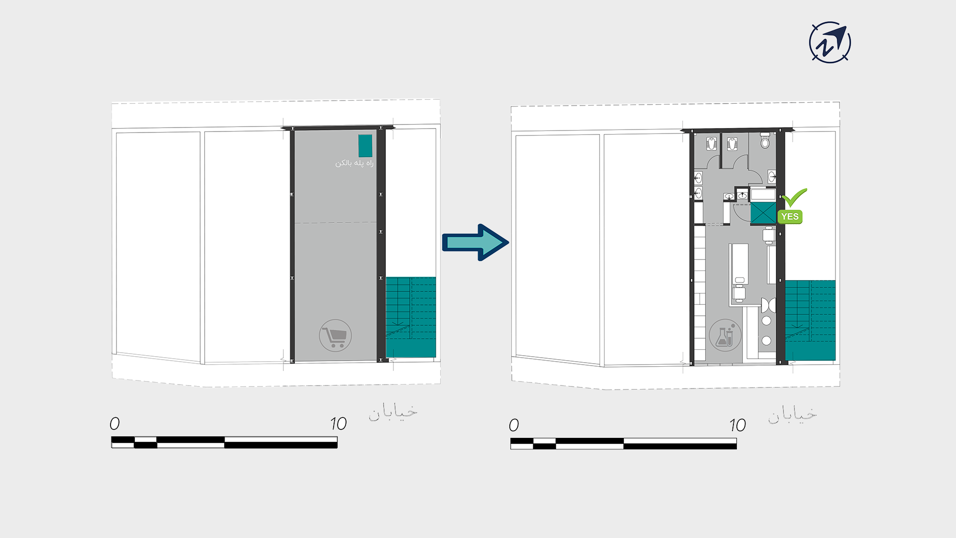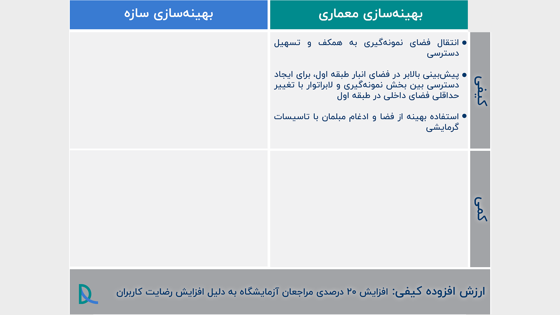 در این پروژه به دلیل انجام فرایند بازسازی وعدم امکان توقف فعالیت‌های آزمایشگاه، پیش‌بینی فضای نمونه‌گیری در همکف و ایجاد دسترسی آسان بین بخش نمونه‌گیری و لابراتوار در دستور کار طراحان قرار گرفت و در نهایت پاسخگویی بهینه به نیازها باعث افزایش تعداد مراجعان شده و با آورده مالی قابل توجهی برای کارفرما همراه شد.